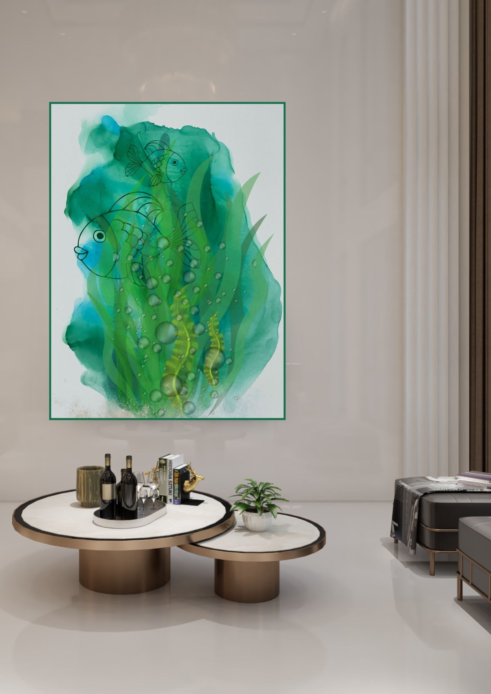 Das Poster hat die Farben Grün und Blau. Dadurch wirkt es entspannt. Die Fische geniessen die Ruhe.