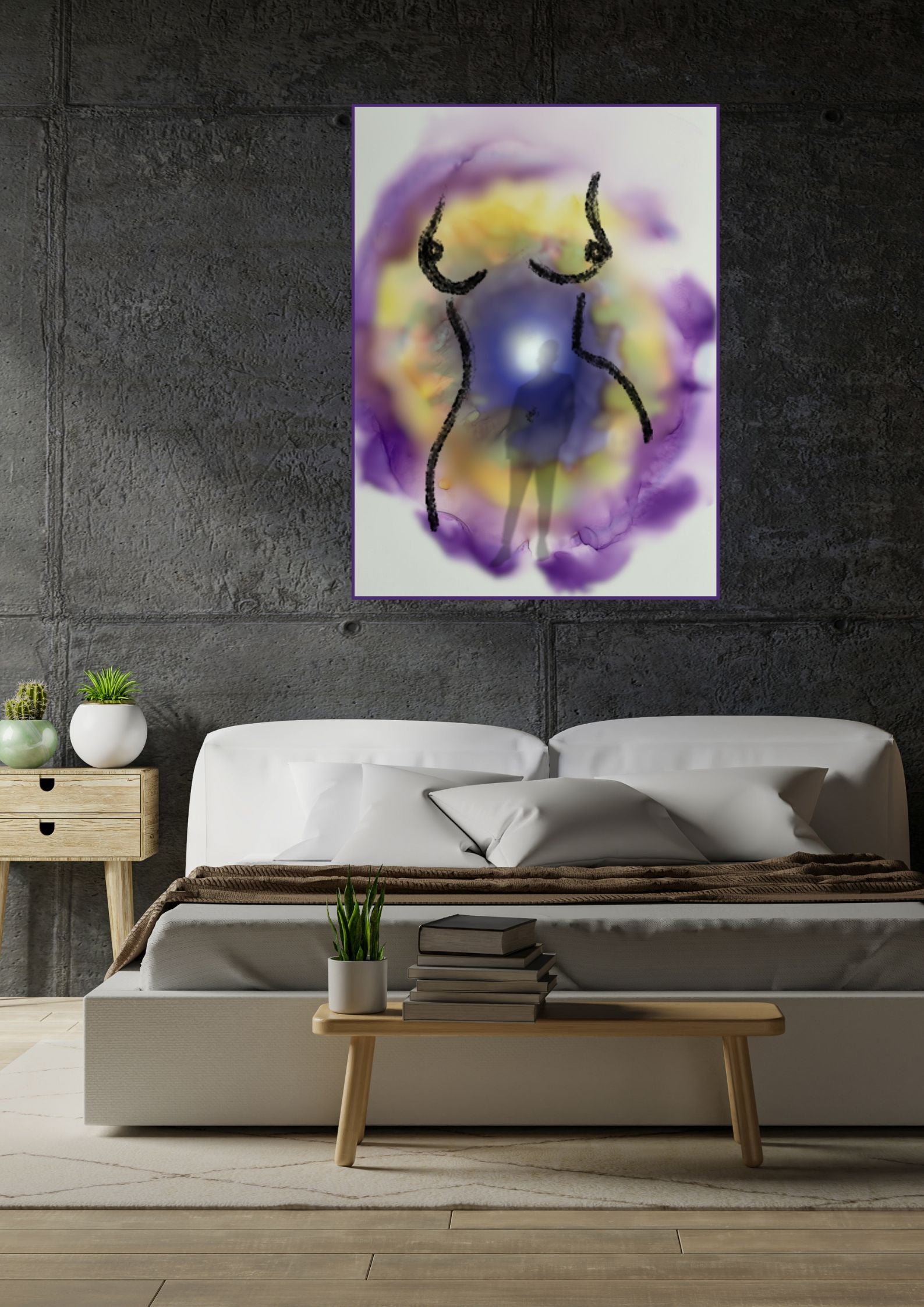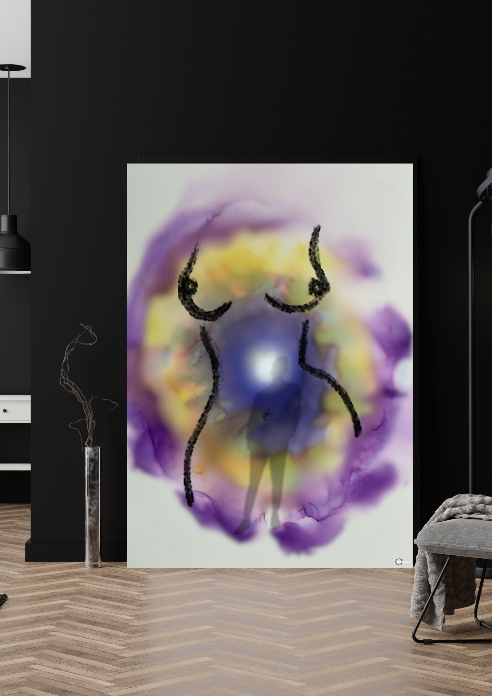 Das Poster ist in den Farben Violett und Gelb gehalten. Es vermittelt Vertrauen und Hoffnung. Die Illustration zeigt einen Frauenkörper mit schönen weiblichen Kurven und strahlt die Sanftheit der Frau aus.