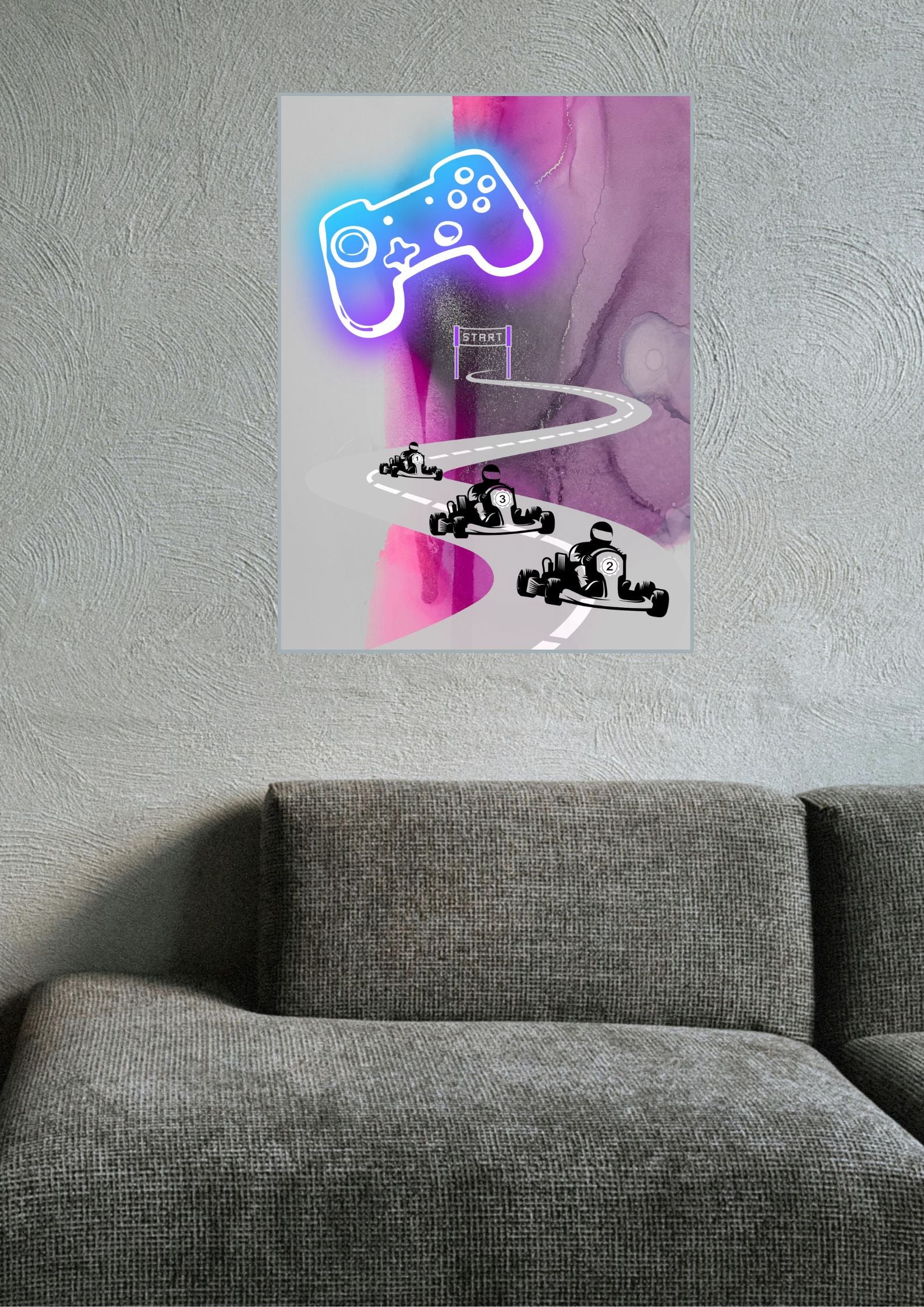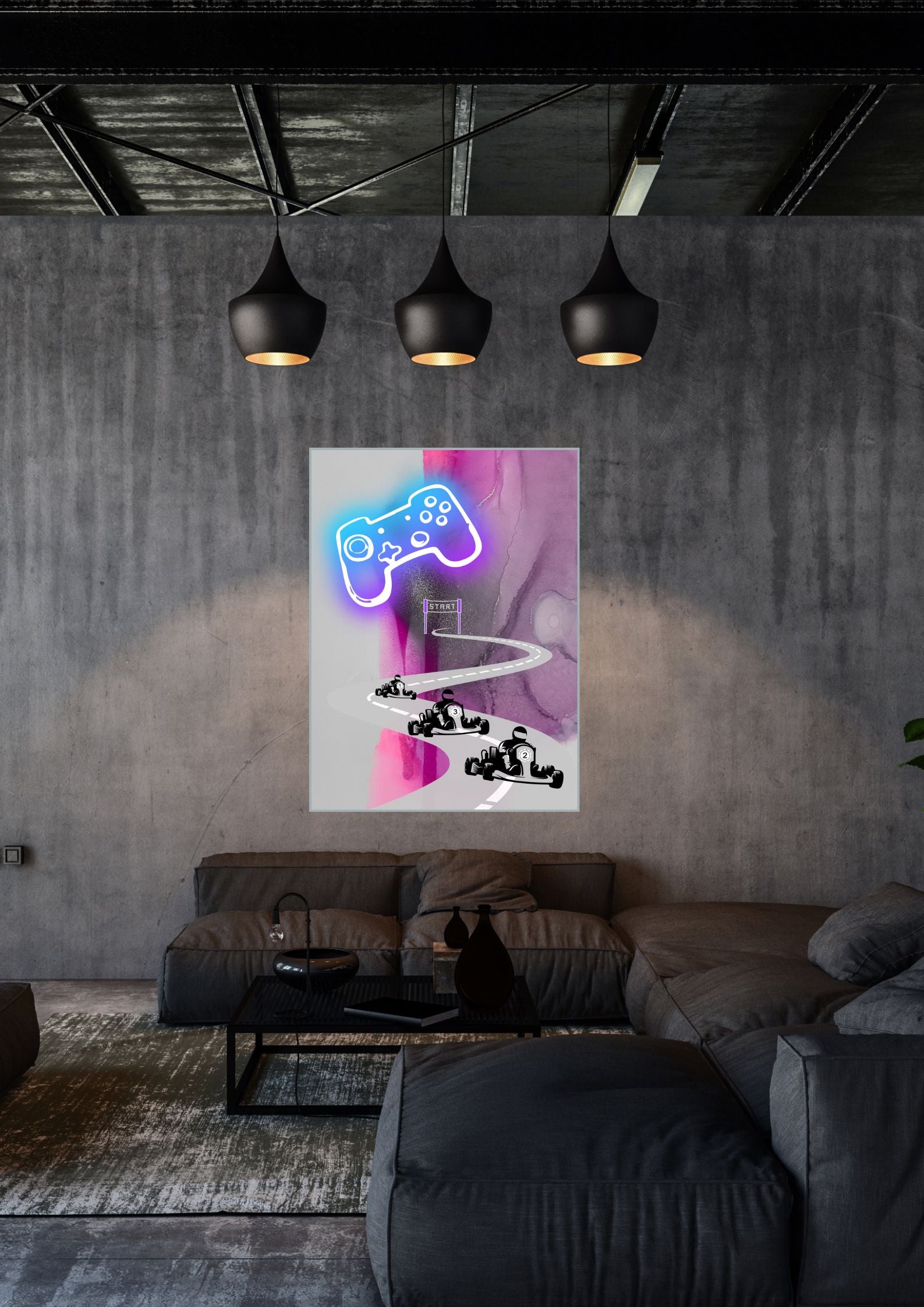 Das im Loft aufgehängte Gaming-Poster schafft eine lockere Atmosphäre.